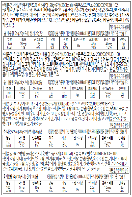 원재료명 및 함량 (농수산물의 원산지 표시에 관한 법률에 따른 원산지 표시 포함) | *후르츠롤쿠키R-화이트초콜릿(벨기에/백설탕,코코아버터,전지분유,레시틴,천연바닐라향),밀가루(미국,호주산),버터(뉴질랜드/유크림100%),설탕,아몬드분말,난황,건조파파야다이스0.92%(태국산),건조키위0.92%(중국산),건조망고다이스0.92%(태국산) *도지마롤쿠키 딸기R-당류가공품38.94%{말레이시아산/설탕,식물성유지,유청분말,전지분유,레시틴,딸기향,합성착색료(식용색소적색제3호)},버터(뉴질랜드/유크림),밀가루(미국,호주산),밀가루(강력분/미국,캐나다),설탕,난황,아몬드분말,대두유,혼합제제0.04%{딸기농축액5%(국산)} *프린스롤쿠키R-초콜릿(벨기에/코코아매스,백설탕,코코아버터,레시틴,천연바닐라향),밀가루(미국,호주산),버터(뉴질랜드/유크림100%),설탕,아몬드분말,코코아분말(코코아분말100%),난황 *도지마롤쿠키 초코R-밀가루(미국,호주산),버터(뉴질랜드/유크림),설탕,아몬드분말(미국산),난황,코코아분말1.89%(프랑스/코코아분말100%) *바닐라쿠키샌드R-밀가루(미국,호주산),버터(뉴질랜드/유크림),당류가공품{설탕,식물성유지,밀크파우더,레시틴,소르비탄지방산에스테르,천연향료(바닐라향)},분당,당류가공품(저감미당),난황(국산),기타밀가루,물엿,마가린,바닐라페이스트1%(프랑스/백설탕,바닐라추출물12%,주정,바닐라빈파우더7%),가공소금 *라즈베리쿠키샌드R-밀가루(미국,호주산),버터(뉴질랜드/유크림100%),분당(원당,옥수수전분),당류가공품{설탕,식물성유지,밀크파우더,레시틴,소르비탄지방산에스테르,천연향료(바닐라향)},과채가공품5.5%(프랑스산/산딸기85%,전화당시럽15%),난황,기타밀가루,설탕,마가린,저감미당,딸기분말,당류가공품(내추럴믹스딸기),물엿,가공소금,레몬주스 *초코쿠키샌드R-밀가루(미국,호주산),버터(뉴질랜드/유크림100%),분당(원당,옥수수전분),당류가공품{설탕,식물성유지,밀크파우더,레시틴,소르비탄지방산에스테르,천연향료(바닐라향)},난황(국산),코코아분말3.2%(프랑스산),저감미당,마가린,기타코코아가공품2%{말레이시아산/코코아분말8%,합성향료(초코렛향)},물엿,가공소금 *플로랑탱 플레인R-버터(뉴질랜드/유크림),밀가루(미국,호주산),설탕,분당(원당,옥수수전분),기타밀가루(미국산),가공유크림[독일산/유크림,혼합제제(유단백,전분,유화제,결정셀룰로오스,셀룰로오스검)],아몬드분태(미국산),난황,아몬드분말,물엿,사양벌꿀,바닐라페이스트,가공소금 *플로랑탱 프린스R-버터(뉴질랜드/유크림),밀가루(미국,호주산),분당(원당,옥수수전분),가공유크림[독일산/유크림,혼합제제(유당백,전분,유화제,결정셀룰로오스,셀룰로오스검)],설탕,아몬드분태,난황,기타밀가루,아몬드분말,물엿,사양벌꿀,코코아분말,코코아매스,가공소금 |